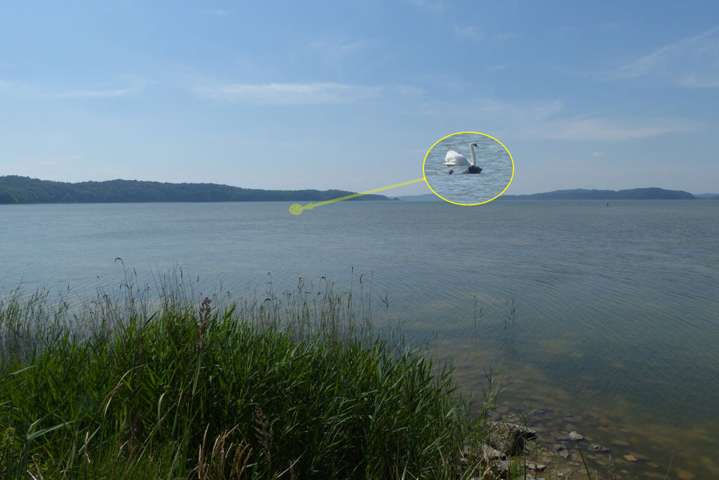 Etwas anders war die Situation danach auf der Insel Rügen am kleinen Jassmunder Bodden. Zwar waren wir dort auch alleine, aber im Gegensatz zu dem langen Strand, gab es dort nur eine „Einlassstelle“. Das restliche Ufer war mit Schilf zugewachsen. Und wir der Deibel es will, kam dann ein netter Schwan und zog Amaroks Aufmerksamkeit auf sich. Amarok folgte ihm dann, meist mehr springend als schwimmend durch das flache Wasser, …ganz schön weit!