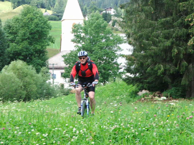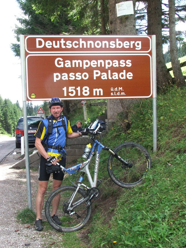 Aber wo es rauf geht, geht es auch wieder runter. Schließlich fanden wir den Brandiswaalweg und folgten ihm bis Tisens. Ein schöner, teils aber auch sehr steiler Wanderweg immer am Hang hoch. Oben ging es zunächst über kleine Asphaltstraßen nach Bad Gfrill. Ab dort begann der Wanderweg 13 zum Gampenjoch, und da er im Winter als Rodelbahn benutzt wird, war er entsprechend steil und kurvenreich. Oben waren wir total durchgeschwitzt und mussten erst mal die Trikots wechseln. Eine Portion Spaghetti brachte die Kräfte zurück.