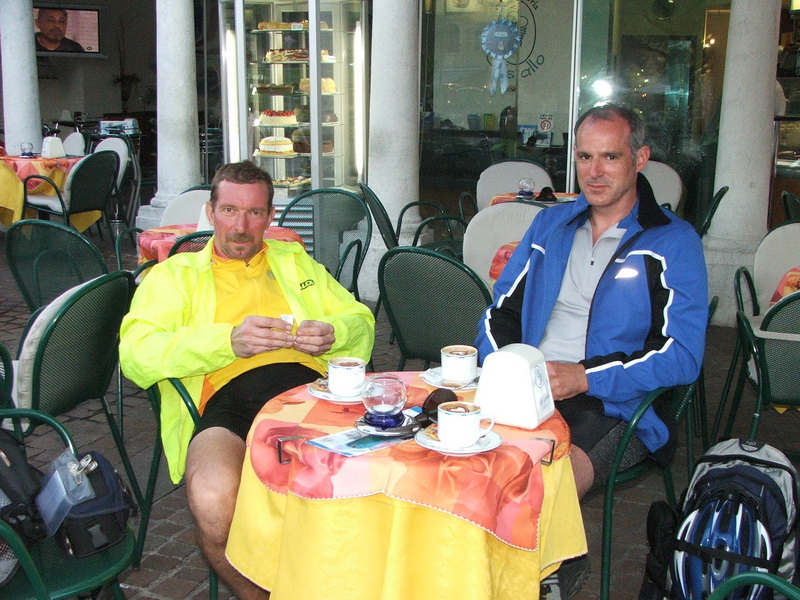 Kurz vor 19:00 Uhr fuhren wir durch das Zentrum direkt zum Hafen, bis auf den Kai! Wir waren am Ziel! Groß war die Freude, es (doch noch) geschafft zu haben. Roger und ich gratulierten uns gegenseitig zur gelungenen Alpenüberquerung und machten noch ein paar Erinnerungsbilder. Der nächste Weg führte in eine Eisdiele; dort trafen wir Ulrike mit Giovanni. Das folgende Eis schmeckte besonders gut. Es wurde schon dunkel, als es zum Campingplatz ging. Der nächste Tag sollte erst mal Gammeltag sein.