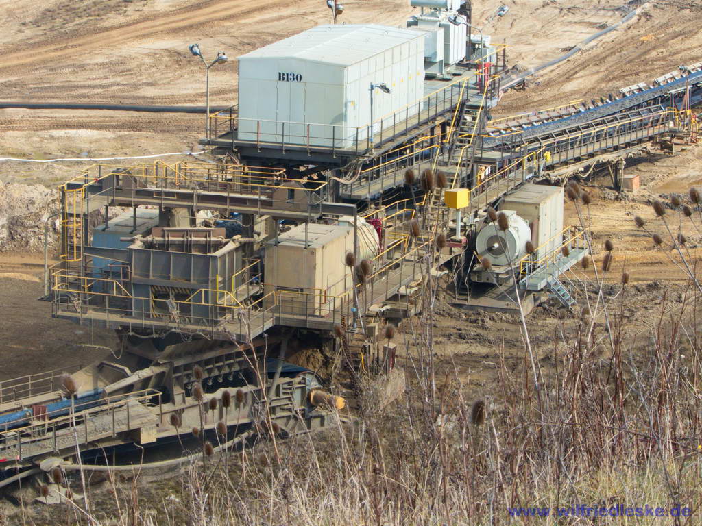 Man sieht rechts die Abraumbagger, wie sie den Boden abtragen und an eine Bandanlage übergeben. Über diese Bänder wird der Abraum um den Tagebau herumtransportiert, bis er auf der andern Seite von Absetzern wieder aufgeschüttet wird. Das ganze geschieht auf mehreren Etagen, bis unten die Kohle freigelegt wird. Auch sie wird mit Schaufelradbaggern auf Bänder geladen und dann direkt zum schon erwähnten Kraftwerk befördert.