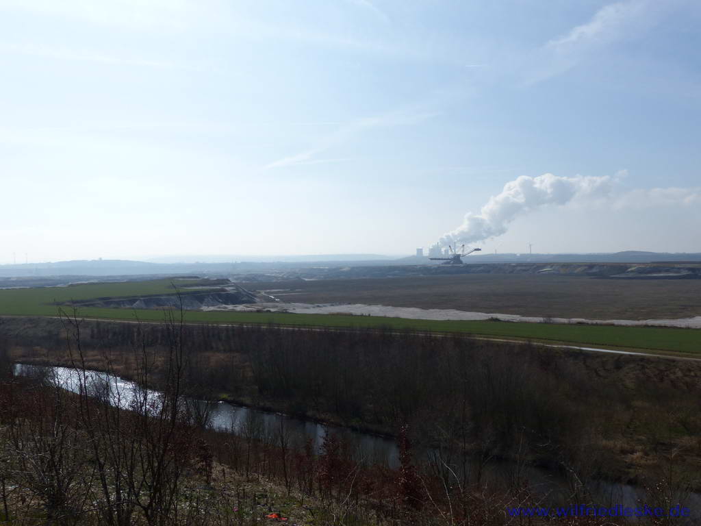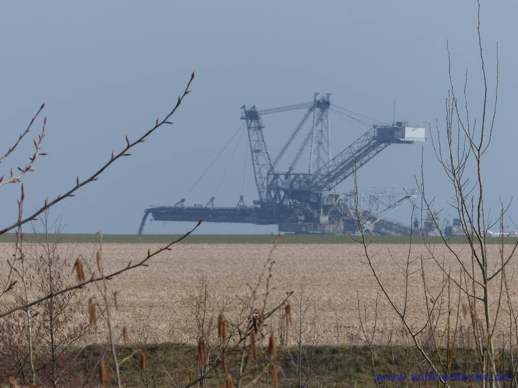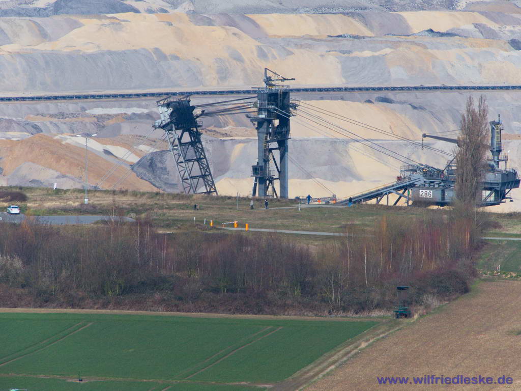 Hier befindet sich auch ein neuer Aussichtspunkt. Nun ist man ganz dicht an der Abbaukante. Die Schaufeln des Abraumbaggers drehen sich unermüdlich. Die Ortschaft Pier wurde gerade von ihnen „verschluckt“. Es ist auch bemerkenswert, wie dicht die Abbaukante neben Schophoven verläuft. Das wird bestimmt interessant, wenn sich hier so ca. in 15 Jahren das Ufer des neuen Sees befindet. Wohnen am Wasser!