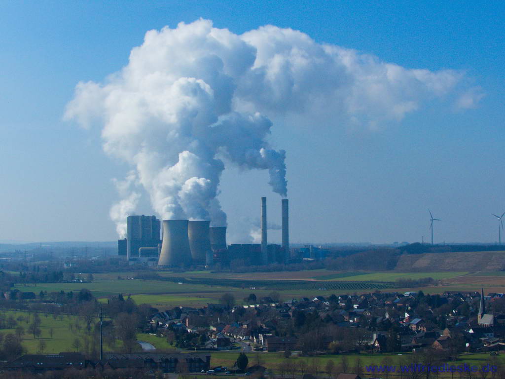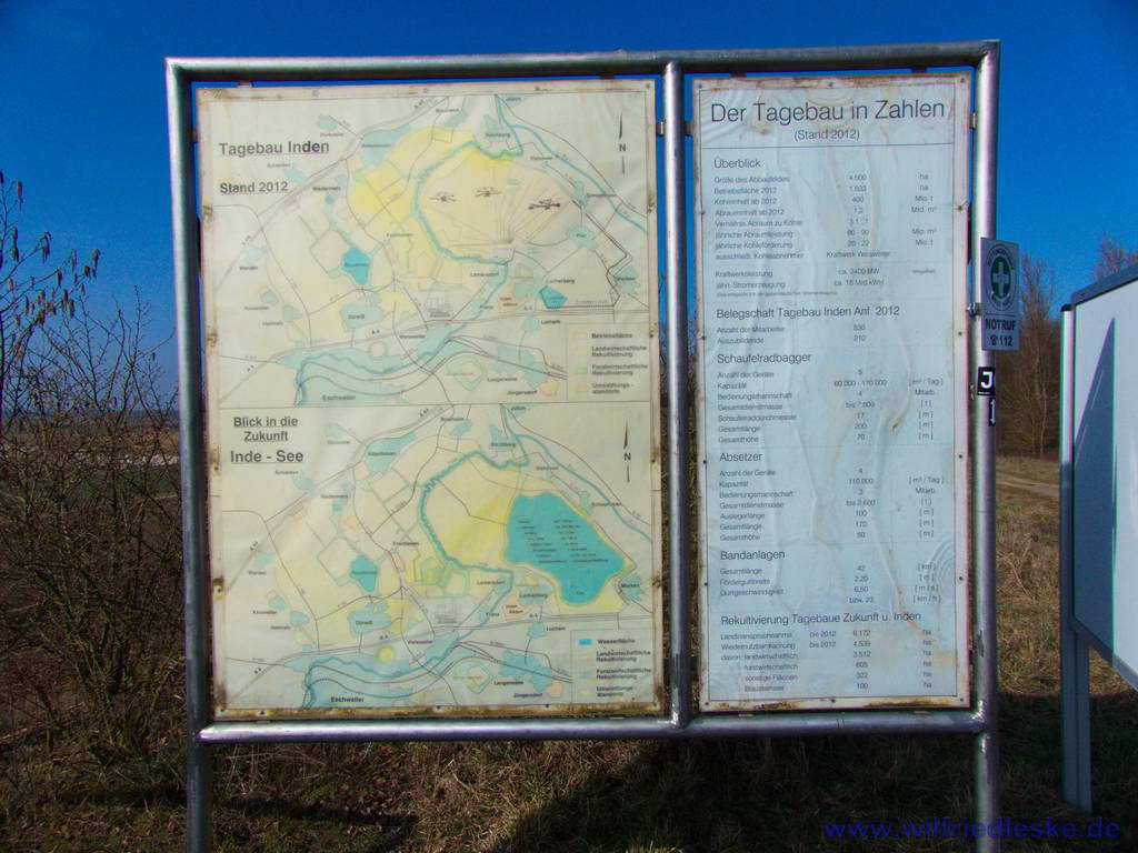 Kurze Zeit später steigt der Weg langsam an. Man blickt von oben in das Indetal und über den vor uns liegenden Tagebau Inden. Parkbänke laden zur Pause und zum Genießen der Aussicht ein. Auf Infotafeln wird die Ausdehnung des Tagebaus erläutert. Wie Spielzeug wirken die riesigen Bagger zur Braunkohlegewinnung aus der Entfernung. Am Horizont markiert die Silhouette des Kraftwerk Weisweiler das Ende der Abbaukette. Ab dort wird die gewonnene Energie über Freileitungen verteilt.