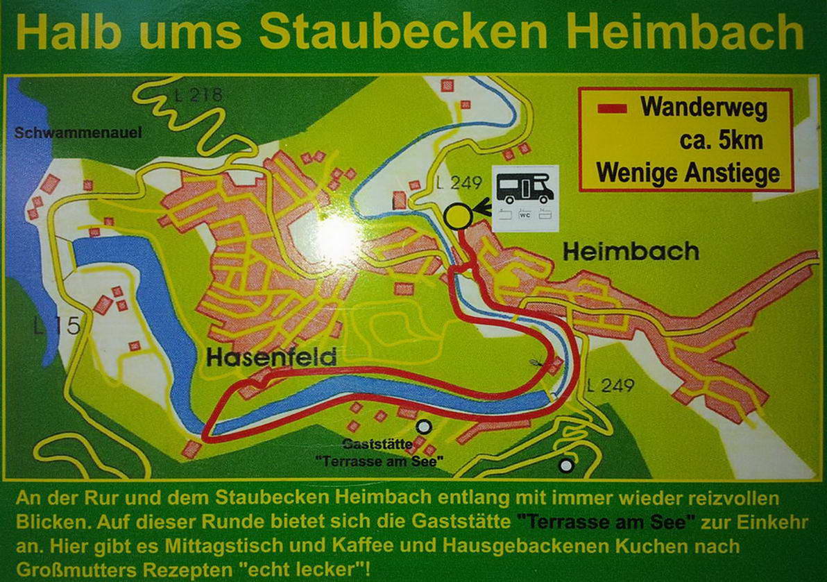 Heimbach ist ein staatlich anerkannter Luftkurort in der Eifel und liegt im Tal der Rur an der Rurtalsperre Schwammenauel und am Stausee Heimbach. Die Stadt hat sehr viel Tourismus und wie könnte es da anders sein, auch einen Wohnmobilhafen. Dieser befindet sich unmittelbar neben dem Bahnhof und bietet Platz für ca. 20 Wohnmobile.