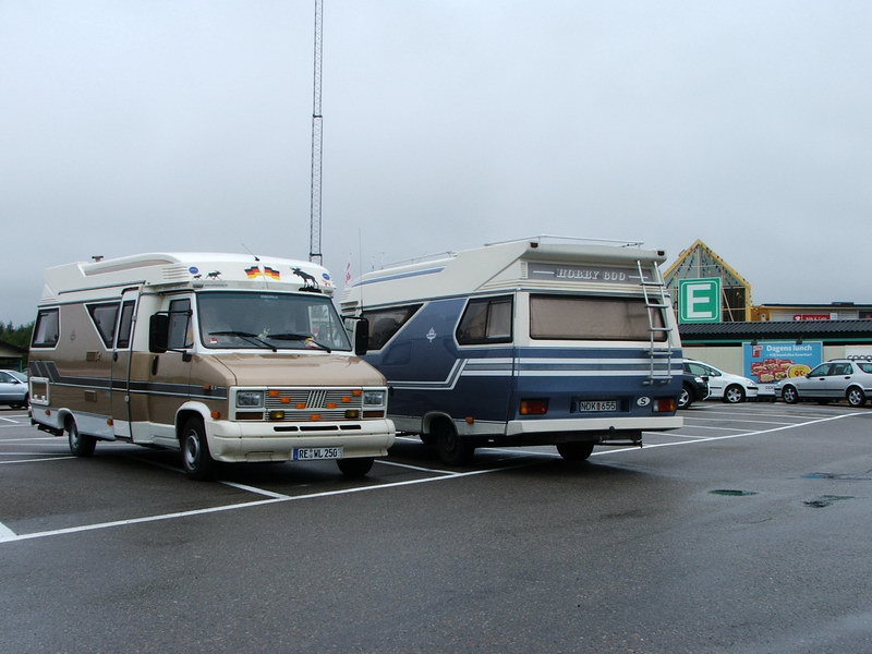 Nun wurde die E4 immer abwechselnd zwei- bzw. einspurig. Abgetrennt durch gespannte Seile. Das war schon sehr gewöhnungsbedürftig, zumal ein reger Verkehr herrschte. In Söderhamn hielten wir an einem Einkaufszentrum; wir mussten ja unseren Kuchen kaufen. Als wir heraus kamen, fuhr ein blauer Hobby 600 auf den Parkplatz und stellte sich neben unser Fahrzeug. Natürlich kamen wir sofort mit den Besitzern ins Gespräch. Sie fuhren schon seit sieben Jahren einen 88er Benziner. Mit guten Wünschen trennten wir uns wieder, nicht ohne Ihnen eine Karte zur Webseite mitzugeben.