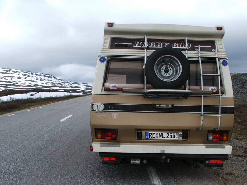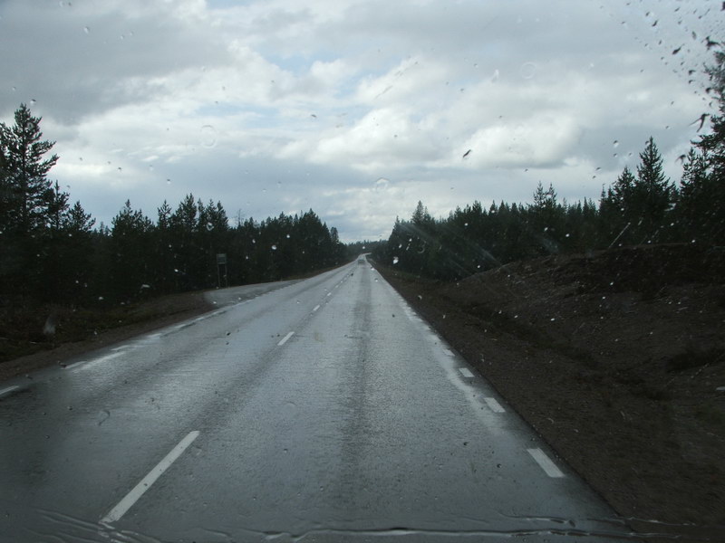 Der nächste Morgen begann wie angekündigt mit „Hund im Wasser". Dann ging es wieder auf die E4. Heute wollten wir bis zum Polarkreis. Bis Umeå folgten wir den Wegweisern mit dem schönen Namen Haparanda. Hier überquert die E4 die finnische Grenze. Aber so weit wollten wir ja nicht. Wir bogen also bei Umeå auf die E12 in Richtung Mo I Rana, verließen diese bei Lycksele nach gut 130 km aber schon wieder und folgten der Rv365 in Richtung Arvidsjaur. Bei Rusksele fanden wir einen tollen Rastplatz für unsere Kaffeepause. Nur eine Tankstelle mussten wir etwas länger suchen. Die erste Münzsäule war leer - der Tankwagen kam erst morgen Nachmittag wieder. An der zweiten Tanke wurden wir dann fündig. Glücklicherweise war sie mit Personal besetzt, sonst wäre unsere Mastercard nicht akzeptiert worden. I