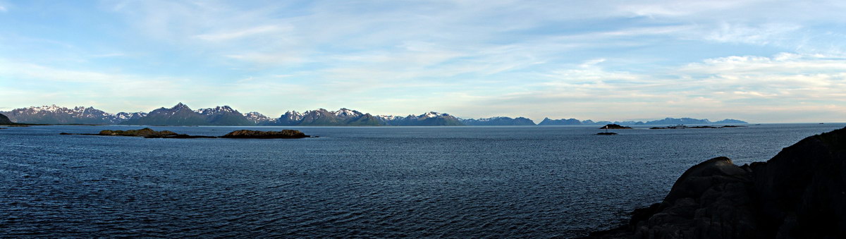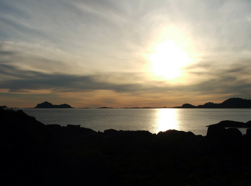 Bei Taen befindet sich an einem wunderbaren Sandstrand ein Badeplatz mit Parkplatz. Hier blieben wir über Nacht. Wir konnten mit Giovanni noch einen schönen Spaziergang über das felsige und mit Buschwerk durchwachsene Gelände machen und hatten dabei einen schönen Blick auf die Lofoten. Ganz in der Ferne konnte man den Hoven sehr gut erkennen. Da wir diesmal auf der Südseite der Insel standen und die letzte Nacht eher kurz war, ging es heute mal früher zu Bett.