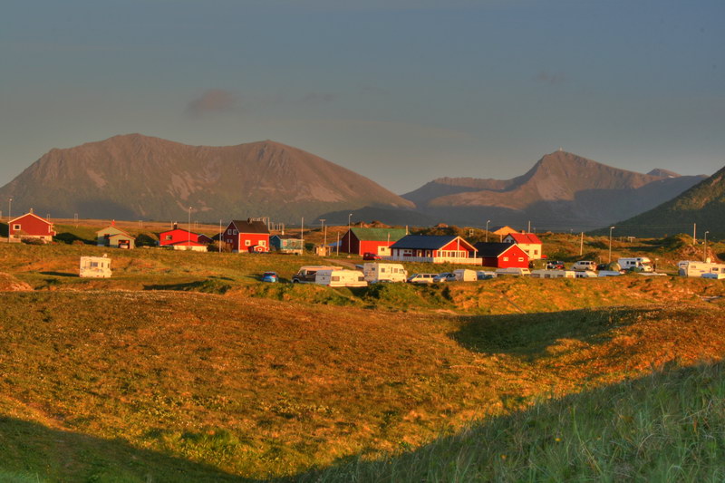 Ich musste mir schon etwas einfallen lassen, um die Motive interessanter zu gestalten. Immer nur Mitternachtssonne über dem Meer wird mit der Zeit auch langweilig. So versuchte ich es diesmal mit Aufnahmen aus der Bodenperspektive. Das sich das Sandgras dabei im Wind bewegte, ist eventuell ein kleiner Nachteil. Andersrum boten Campingplatz und Bergkette im Schein der Sonne auch einen tollen Anblick.