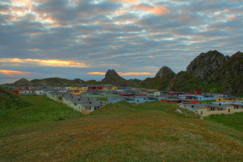 Zufrieden fuhren wir wieder zum Campingplatz, wo wir erst einmal wieder feste Nahrung zu uns nahmen. Wir stellten fest, dass wir gerade den Höhepunkt unserer diesjährigen Urlaubsreise überschritten hatten. Andenes war außerdem der nördlichste Punkt. Ab Morgen ging es wieder in Richtung Heimat. Aber pünktlich zu Mitternacht schickte die Sonne doch noch ein paar Strahlen durch die Wolkendecke und ich konnte noch ein paar Fotos schießen. Um nicht schon wieder Sonne über Meer zu haben, wählte ich diesmal eine Einfamilienhaussiedlung als Vordergrund. Obwohl schon geschützt zwischen den Dünen gelegen, hatten alle Häuser hohe Bretterzäune um ihre „Gärten" und die Fenster bestanden weitgehend nur aus Oberlichtern. Da kann man sich ungefähr vorstellen, wie die Verhältnisse im Herbst oder Winter hier sein müssen. Heute war mit 9°C ja schon fast Sommer.