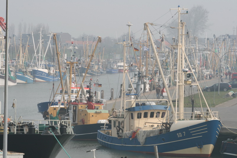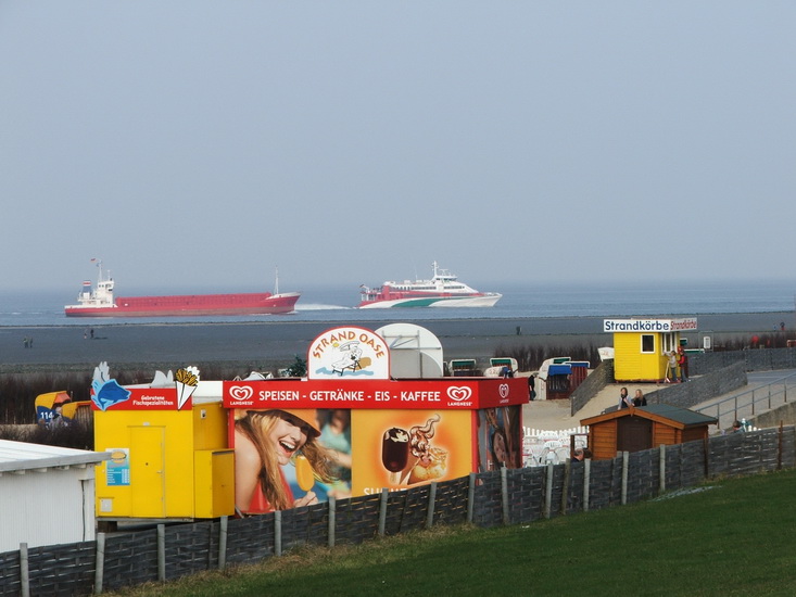 Die Fähre brachte uns am nächsten Tag auf die andere Flussseite. Unser nächstes Ziel hieß Cuxhaven. Der dortige Stellplatz war wegen der bevorstehenden Osterfeiertage schon reichlich voll. Da wir aber nur eine Nacht bleiben wollten, würden wir es schön überleben. Nach einem Hafenbummel fuhr ich mit Giovanni am Rad etwas an der Küste entlang und konnte Schiffe und Leute beobachten.