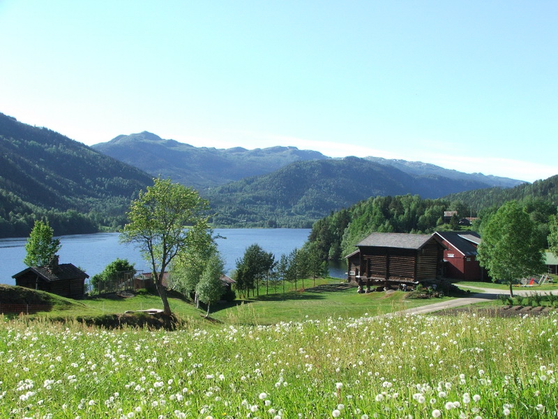 Unser erstes Hauptziel sollte Flåm am Aurlandsfjord, einem Seitenarm des Sognefjord sein. Wir entschieden uns für einen Weg durch das Numedal nach Geilo, da wir die anderen Routen durch Hallingdal und Begnadal schon kannten, und wir außerdem Oslo durch Benutzung des Oslofjord-Tunnel umfahren konnten. Die Strecke selbst führte sehr abwechslungsreich immer am Fluss Lågen entlang, der sich stellenweise zu schönen Badeseen verbreiterte. Das Tal ist sehr waldreich, mit grünen Almwiesen und dünn besiedelt. Die Bauernhöfe sind dafür umso schöner. Einige stehen unter Denkmalsschutz und laden zur Besichtigung ein. Hinter Uvdal verändert sich das Tal landschaftlich sehr stark. Die Straße führt kurvig bis auf 1000m hinauf. Die Vegetation wird karger und die zunehmende Anzahl an Hütten lässt auf ein stark frequentiertes Wintersportgebiet schließen. Mit Geilo erreicht man einen größeren Wintersportort am Fuße der Hardangervidda. Der Campingplatz liegt am Fluss und auf der anderen Fluss-Seite liegt ein großes Hotelgelände mit Golfplatz – über eine Brücke zu erreichen. Gerade richtig für einen schönen Hundespaziergang in der Abendsonne.
