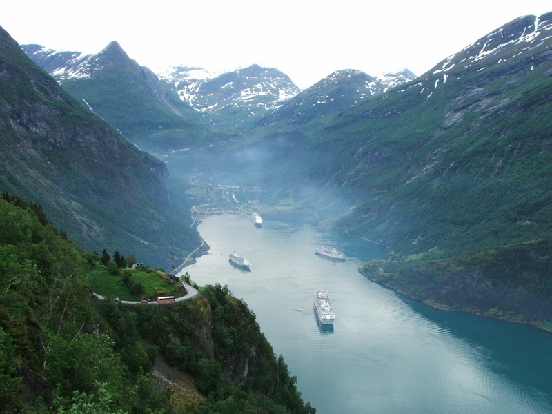 Diese Ausblicke begleiteten uns weiter auf der Rv63. Vor uns tauchte der Dalsnibba auf. Eine mautpflichtige Straße führt noch einmal 500 m höher auf den Gipfel. Von dort hat man eine herrliche Aussicht auf den Geirangerfjord. Wir wollten unserem Womo diese Strapazen allerdings nicht zumuten. Uns reichte der Blick aus rund 1000 m Höhe auf den Fjord. Und dort unten sahen wir ein Schiff liegen. Wie sich später herausstellte war es die „Queen Elisabeth 2“. Das besondere waren aber die Abgase der Queen. Sie stiegen bis zu einer Höhe von ca. 300 m senkrecht hoch und prallten dann auf die darüber liegende Luftschicht. Dort verteilten sich die Abgase waagerecht zu einer blauen Dunstschicht im sonst so klaren Fjord.