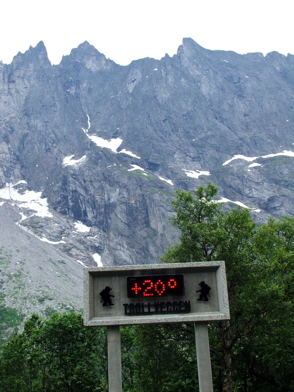 Einem kurzen Abstecher nach Åndalsnes folgte die Fahrt durch das Raumatal. Hier trifft man zunächst auf Trollvegen und Trolltindene, die höchsten Felswände Europas. Sie ragen bis 1800 m hoch, wobei der senkrechte Teil mit fast 1000 m Höhe rund 50 m überhängt. Dass man bei so hohen Felsen die Sonne im Tal selten sieht, ist logisch, dass es mit 20°C ziemlich warm war, ist umso verwunderlicher.