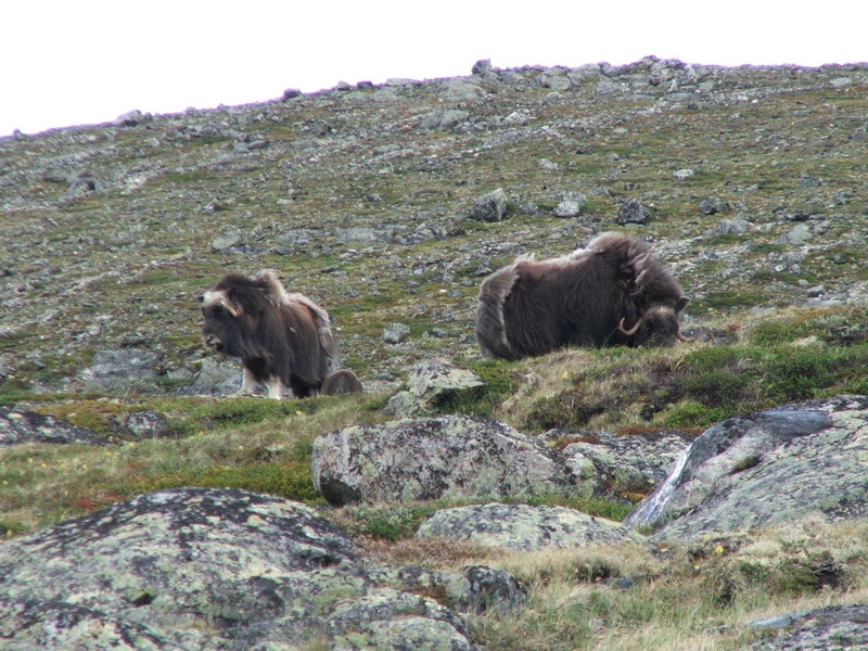 An der Kongsvold Fjellstue starteten wir unsere Mochussafari. Wir folgten den Wegweiser zur Reinheim- Hütte. Nach knapp einer Stunde Wanderung trafen wir auf die erste Gruppe von acht Moschusochsen. Aus gebührender Entfernung betrachteten wir diese mächtigen Wildtiere. Sie wurden vor dem 2. Weltkrieg aus Ostgrönland erfolgreich im Dovrefjell „eingebürgert“. Aktuell soll es rund 250 Tiere im Nationalpark geben. Wir beobachteten die Tiere eine ganze Weile, gingen aber dann noch weiter ins Fjell hinein. Hinter einer Felszunge sah ich plötzlich ein Tier unmittelbar über mir. Vorsichtig gingen wir weiter und sahen uns insgesamt fünf Tieren gegenüber. Ulrike zog sich mit Giovanni etwas zurück und ich nutzte die Gelegenheit zu einigen schönen Fotoaufnahmen. Dichter wollte ich aber auch nicht an die Tiere herangehen.