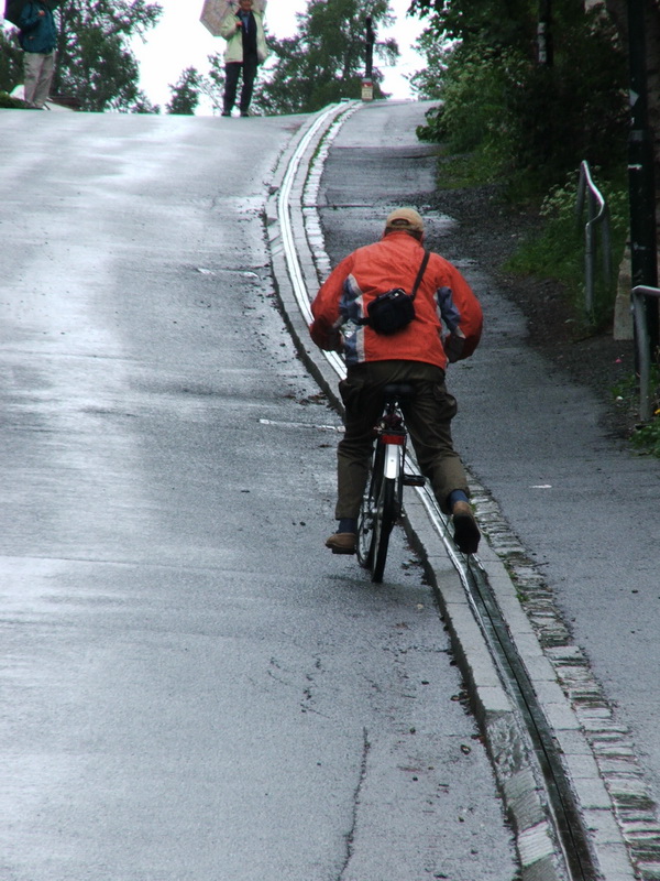 Wir erreichten Trondheim an einem Sonntagnachmittag und konnten so mit dem Wohnmobil bis in die Innenstadt hineinfahren. Wir fanden einen Parkplatz am Rande der Speicherhäuser und machten zunächst einen Stadtbummel. Ich weiß nicht, ob es am Wetter oder am Sonntag lag, aber es war nicht viel los. So konnten wir die Sehenswürdigkeiten wenigstens in Ruhe anschauen. Nur den Nidaros-Dom schenkten wir uns. Ulrike findet es unverschämt, wenn für den Besuch einer Kirche Eintritt verlangt wird. Und da hat sie Recht! Dafür gab ich einem jungen Mann, der mir sein Rad und die Liftkarte lieh, gerne 20 Kronen. Wann fährt man schon Fahrradlift? Den gibt es nur in Trondheim und das ist auch gar nicht so einfach; Bein imer schön steif halten!.