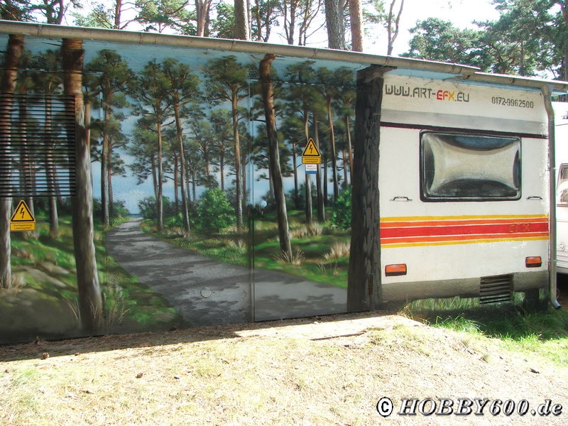 auch wieder neben dem FKK). Besonders schön war dies am nächsten Morgen. Da hatten wir den Strand fast für uns ganz alleine und störten niemanden. Auf dem Weg zum Strand befand sich ein Toilettenhäuschen und das war, so wie auch viele Trafostationen auf Usedom, wunderbar bemalt.