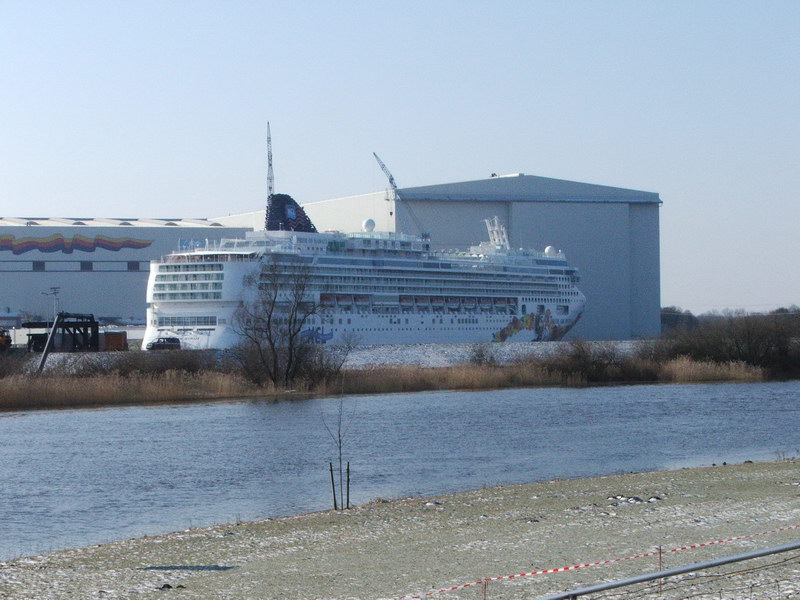 So fuhr ich am Samstagmittag in dichtem Schneetreiben über die A 31 nach Papenburg. Ich steuerte zunächst direkt die Meyer Werft an und sah auch schon von weitem das mächtige Schiff vor der Halle liegen. Auf dem Parkplatz zwischen Straße und Dockbecken standen schon rund 50 Wohnmobile. Ich stellte mich dazu und inspizierte bei einem Spaziergang um die Werft das Schiff und die Dockschleuse etwas genauer. In der Ems fehlte aber noch reichlich Wasser!