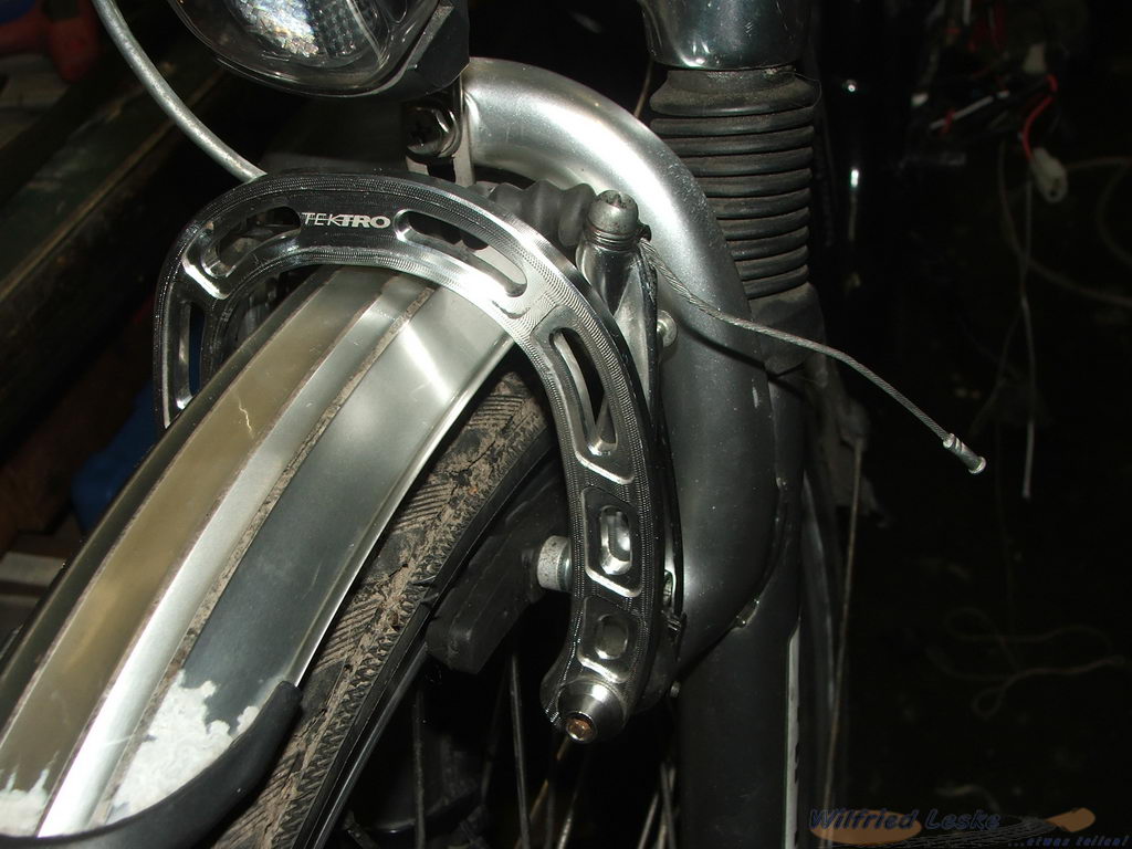 Im Bremshebel des Prophete Citystar ist ein Kontakt zur Abschaltung des Motor integriert. Leider hat der Hebel aber keine Rändelschraube zur Nachstellung des Bowdenzugs. Da ich mit einen Bremssensor für den Bowdenzug bestellt hatte, konnte ich den Original Bremshebel gegen einen alten 2-Fingerhebel von meinem Mountain Bike austauschen. Jetzt kann ich die Bremse wenigsten schnell und mühelos nachstellen. Außerdem montierte ich aus Altbeständen noch einen Booster zur Stabilisierung der Bremse.