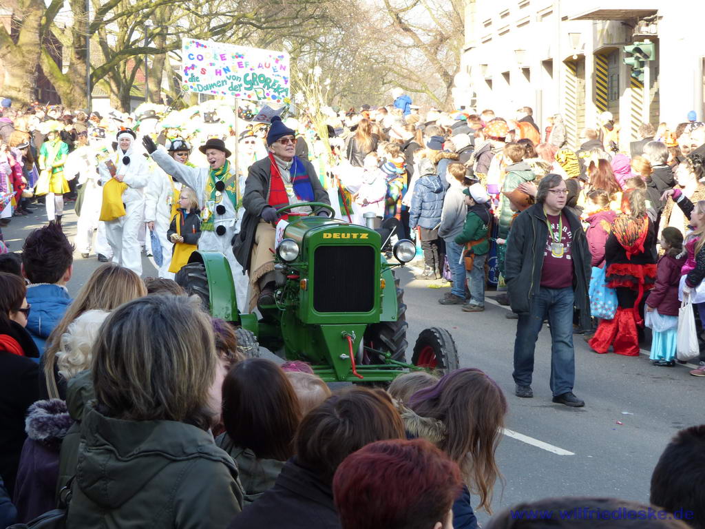 Natürlich waren alle Prunkwagen schon mit Zugfahrzeugen versehen. Aber Helmut durfte mit seinem Trecker die Tanzgarde anführen und das war ein tolles Bild. Der Grün-Gelbe Traktor mit dem alten Mann vor den jungen Mädchen in ihren Grün-Gelben Tanzkleidern. So kam Helmut doch noch zur Teilnahme am Rosenmontagszug; wenn auch mit einem Jahr Verspätung.