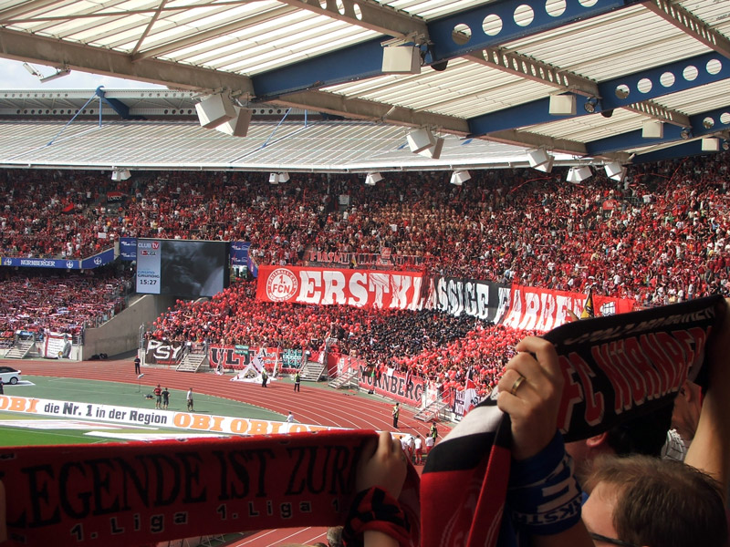 Bei herrlichem Wetter besuchten wir dann am Samstag in Nürnberg das Stadion. Die Plätze auf der Gegengeraden boten eine ausgezeichnete Sicht auf das Spielfeld. Viel besser war aber zunächst die Atmosphäre auf den Rängen. Schalke und Nürnberg verbindet seit Jahren eine intensive Fanfreundschaft und das merkte man auch hier ganz deutlich. Links von uns die Blau-Weißen, rechts die Roten - tolle Stimmung.