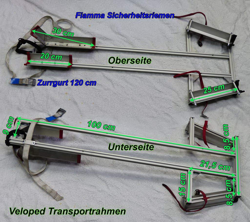 Da der Hersteller für diesen Fall nichts vorgesehen hatte, hieß es also: selber bauen! So entfernt ich die Fahrradschienen vom Carry-Bike Fahrradträger und baute mir aus Alu-Profil 20x20 Nut 6 einen Rahmen, auf dem ich dann wiederrum Teile einer Fahrradschiene für die Aufnahme der Velopedräder befestigte (Bild links). Dieser Transportrahmen wird auf den „nackten“ Fahrradträger geschraubt.