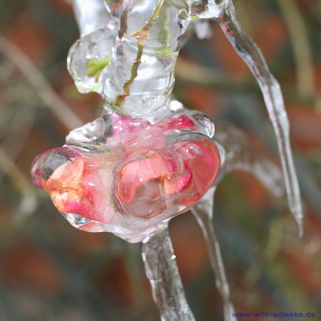 Im Vorgarten haben wir die Situation, dass das Wasser vom Vordach in den Garten auf die Rosen tropft. Im Sommer macht das nicht, aber jetzt hatten wir die Situation, dass das Tauwasser auf eine Blüte tropfte und dort wieder gefror.