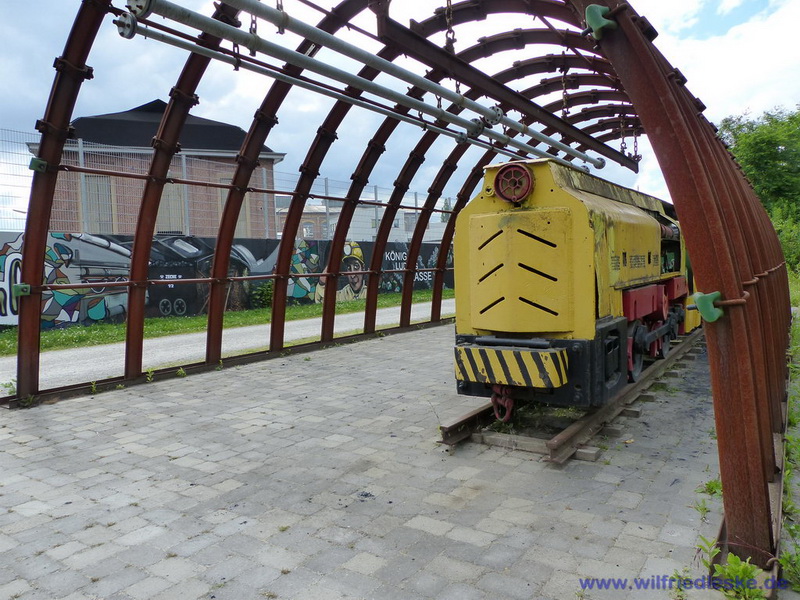 An einer Stelle des Radwegs hat man ein Stück Grubenausbau mit einer original Grubenlokomotive (mit Dieselantrieb) und zwei Loren aufgestellt. Erinnerung an die Bergbaugeschichte. In diesem Bereich wurde die alte Zechenmauer kunstvoll mit Graffitis bemalt, natürlich alles Bergbaumotive. Ein toller Punkt für die Rast während der Radtour.