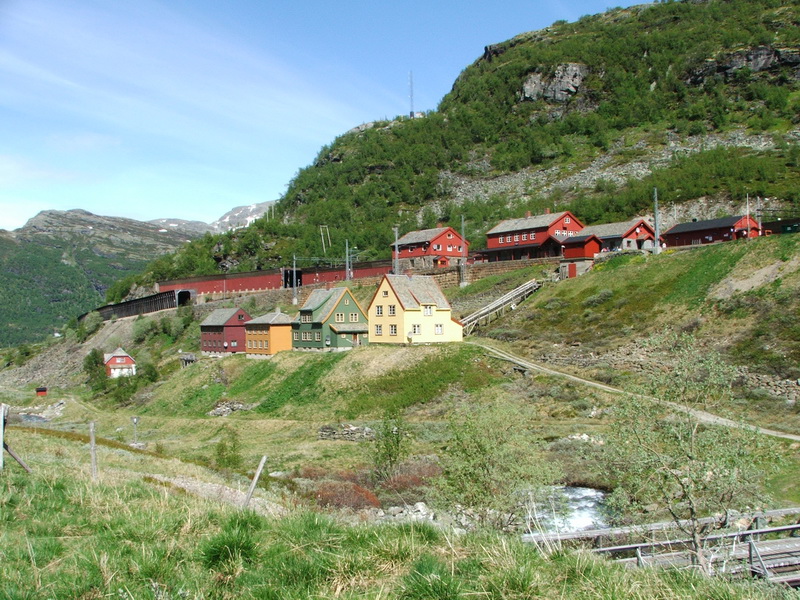Für größeres Bild bitte klicken!Ich fuhr das Teilstück von Flåm nach Myrdal im Juni 2006 als Tagesausflug. Bei herrlichem Wetter startete ich auf dem Campingplatz in Flåm. Die ersten 10 km führte der Weg leicht ansteigend auf einer schmalen Asphaltstraße durch das Flåmtal. Hinter dem Haltepunkt Lunden der Flåmbahn wurde de Besiedlung zunehmend dünner. Und hinter der Kirche sah ich nur noch vereinzelte Häuser abseits der Straße. Bei dem Rjoandefossen verschwindet die Eisenbahn erstmals in einem Tunnel. In der Folge hat man sehr schöne Blicke auf die Bahnlinie. Manchmal lohnt es sich echt auf einen Zug zu warten. Ab Berekvam geht der Weg in eine Schotterpiste über und ist nur noch für Anlieger frei. Durch eine Modelleisenbahnlandschaft fährt man vorbei an Schaf- und Ziegenweiden; die Bahnlinie immer in Sicht- oder Hörweite. Ein ca. 100 m langer Tunnel erfordert höchste Konzentration, wenn man (wie ich) ohne Beleuchtung hindurch fährt. Bei Kårdal liegt ein schöner Rastplatz unmittelbar an einer Brücke über einen Wasserfall. Über eine Ziegenweide fährt man nun weiter bergauf.