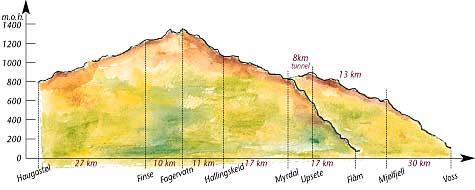 Für größeres Bild bitte klicken!Als zwischen 1895 und 1902 der Hochgebirgsabschnitt der Bergensbahn gebaut wurde, benötigte man zum Bau einen Transportweg – der Rallarvegen entstand. Von Hand gebaut, beginnt der Rallarvegen an der Baumgrenze im Osten bei Haugastøl und führt hinauf in die kargen Berge mit einer schönen Aussicht auf Gebirgsseen, schneebedeckte Gipfel und den Gletscher Hardangerjøkulen. Westwärts Richtung Vatnahalsen und Myrdal trifft man auf prächtige und wilde Gebirgsabschnitte, wie die mächtige Klavaschlucht.