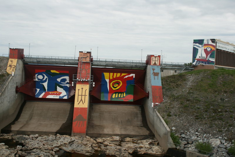 Tag 5 unserer Reise begann mit einem bewölkten Himmel. Auf jeden Fall war das beim Fahren angenehmer. Kurz hinter Jokkmokk hielten wir an dem Akkats-Kraftwerk. Hier sind das Maschinenhaus und die Sperrwerke mit Samen-Motiven bemalt. So kam wenigstens etwas Farbe in das eintönige Grün-Braun der Landschaft, dass nur vom Blau des Wassers unterbrochen wurde. Bei Porjus machten wir einen weiteren Kurzstopp. Von Weitem hatten wir einen schönen Kirchturm gesehen, der sich aber als Maschinenhaus eines Kraftwerks entpuppte. Dabei handelt es sich um eins der modernsten und größten schwedischen Wasserkraftwerke. Da kann man schon mal solch einen protzigen „Kirchturm" draufsetzen. Einen Golfplatz gab es bei dem Kraftwerk übrigens auch.