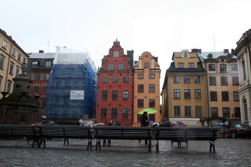 Nach der Wachablösung setzten wir unseren Rundgang durch Gamla Stan fort. Leider regnete es zwischendurch immer mal wieder. Das hatte aber auch seine lustigen Seiten. Auf dem Stortorget sahen wir drei Mädchen unter einem Regenschirm sitzen und die Giebel der Häuser am Markt malen. Zu schön, wenn sie unter dem Schirm hervorguckten und immer mal wieder Maß nahmen.