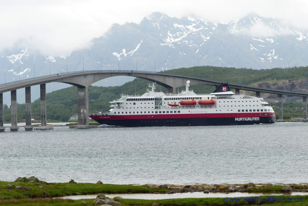 Wir nutzen einen Parkplatz in der Nähe für unsere Kuchenzeit und einen Spaziergang mit dem Hund. Anschließend hatten wir Gelegenheit, die Passage der Polarlys unter der Hadselbrua zu betrachten. Wir fuhren über die Brücke auf die Insel Langøya. 2009 hatten wir die östliche, schnellere Route benutzt. In diesem Jahr fuhren wir deshalb über die westliche Passage direkt an der Küste entlang.