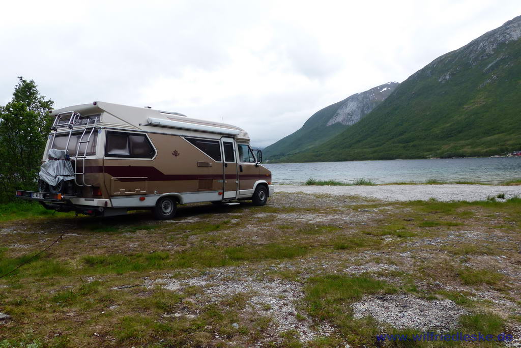 Unmittelbar hinter dem Tunnelausgang sahen wir einen schönen Rastplatz kurz vor Steinfjord direkt am Strand. Das sollte unser nächster Übernachtungsplatz werden. Über die alte Küstenstraße konnte ich mit Amarok schön spazieren gehen und dabei die Sonne genießen. Heute hatten wir zum zweiten Mal Mitternachtssonne!