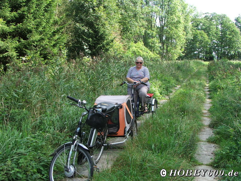 Nach den vielen Seen und Flüssen hatten wir nun Lust aufs Meer bekommen. Im Forum hatten wir einige Tipps zu ruhigen Stellplätzen auf der Insel Usedom bekommen. Es ist schon später Nachmittag, als wir auf dem kleinen Stellplatz am Yachthafen in Netzelkow am Achterwasser ankamen. Die 3 Stellplätze mit Wasserblick auf der Platte waren natürlich schon belegt. Wir stellten uns hinter den Deich auf die Wiese und bezahlten im Restaurantschiff 1 € pro Meter Fahrzeuglänge, so wie es bei Yachten üblich ist. Mit dem Hund erkundete ich die Umgebung und entdeckte Ölförderanlagen. Ich war erstaunt. Damit hatte ich nicht gerechnet: Ölförderung mitten im Naturschutzgebiet. Am nächsten Tag fuhren wir mit den Rädern nach Zinnowitz. Der „offizielle“ Radweg führte über Spurplattenwege durch Wiesen, Felder und einen Wald. Ich hatte nicht den Eindruck, dass er viel benutzt wurde. Zu oft mussten wir den Brennnesseln ausweichen.