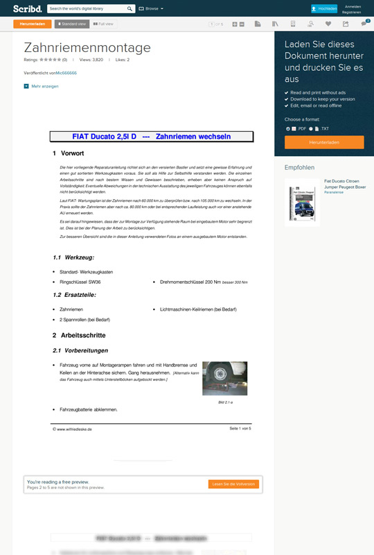 In den letzten Tagen bin ich beim googeln zufällig im Netz auf eine meiner beliebtesten Reparaturanleitungen gestoßen. Im Portal Scribd.com wird die erste Seite meiner Reparaturanleitung zum Zahnriemen wechseln beim FIAT Ducato 2,5 l D unter dem Titel Zahnriemenmontage angezeigt; incl. Copyright-Hinweis! Will man sich dort die komplette Anleitung ansehen bzw. runterladen, wird man zu einem Anmeldefenster geleitet, bei dem man entweder eine Tagesmitgliedschaft für $8,99 oder ein Monats- bzw. Jahresabo abschließen kann.