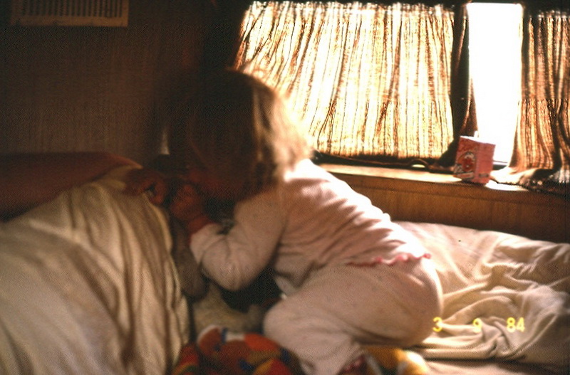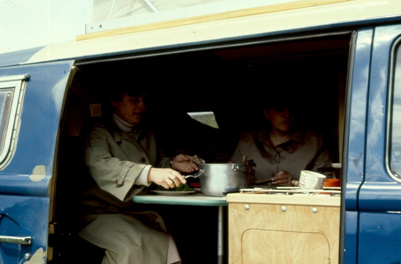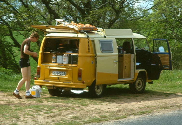Nach knapp vier Monaten Bauzeit ging es Ostern 1981 zum ersten Mal auf Tour - an die Mosel. Danach wurde der Bulli aber aber erst einmal neu lackiert: beige/Orange. In den Folgejahren folgten mehrere größere Touren an die Cote d'Azur und nach Schottland. Allerdings haben sich zwei Dinge nicht bewährt: Die Benzinheizung war im Stand zu laut und verbrauchte zuviel Strom. Es fehlte ein Durchgang vom Führerhaus in den Wohnbereich. Immer außen rum bzw. über den Schrank klettern war nicht ideal, zumal wir dann auch schon zu dritt unterwegs waren.